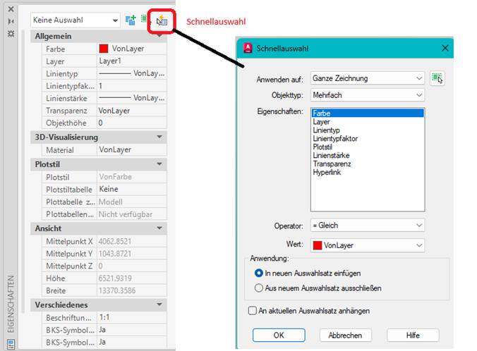Den Befehl SAUSWAHL findet man im Dialogfenster Eigenschaften, es öffnet sich ein Dialogfenster Schnellauswahl