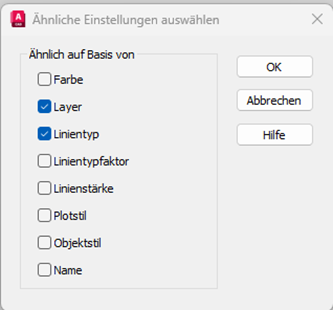 Dabei werden nach OK nur die gewählten Eigenschaften miteinander verglichen. Im Bild werden z.B. nur Objekte als ähnlich gewählt, deren Layer und Linientyp identisch ist – Farbeinstellungen etc. werden nicht berücksichtigt.