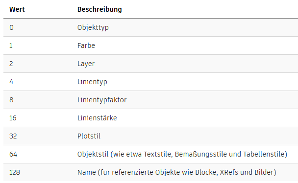 Sollen also, wie in unserem Beispiel nur der Layer und der Linientyp verglichen werden ist die Systemvariable selectsemilarmode 6 (2 für Layer + 4 für Linientyp = 6). Da der Bitcode für Objekt = 0 ist, wird der Vergleich also stets nur für gleiche Objekttypen vorgenommen.
