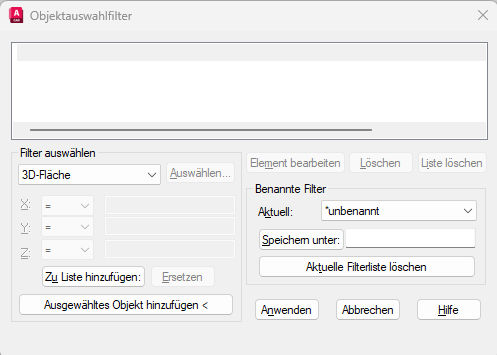 Der entsprechende Filter kann im Dialogfenster Objektauswahlfilter gespeichert werden und steht dann in der Zeichnung zur Verfügung – aber leider nur dort; deshalb sollte ein solcher Filter in der Vorlagedatei inkludiert werden, wenn er öfter benötigt werden sollte. Außerdem kann man dazu ein Aktionsmakro erstellen, das hier jedoch nicht erläutert werden soll.