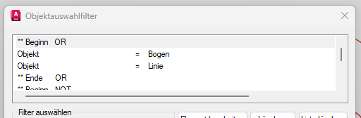 Nach Eingabe des Befehls Filter öffnet sich ein Dialogfenster Objektwahlfilter