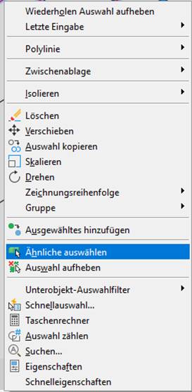 Den Befehl Ähnliches auswählen findet man im Kontextmenü nach Wahl eines oder mehrerer Objekte – AutoCAD sucht dabei nach allen Objekten in der aktuellen Zeichnung, die mit den Eigenschaften des bzw. der ausgewählten Objekte übereinstimmen und fügt diese dem aktuellen Auswahlsatz hinzu.
