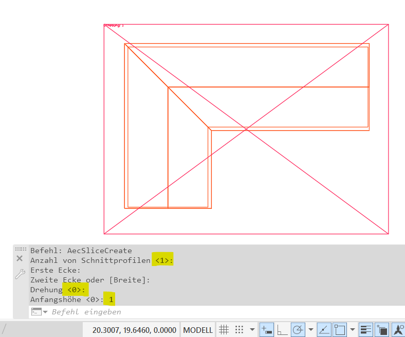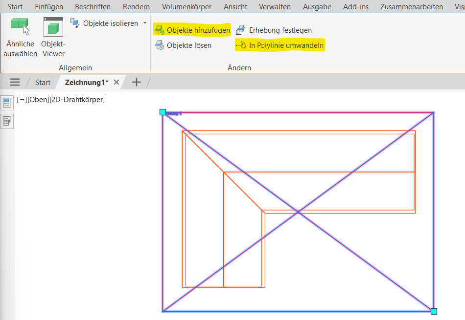 Wählen Sie das Schnittprofil aus und über den Befehl „Objekte hinzufügen“ können Sie nun das Dach hinzufügen. Das 2 Linien dargestellt werden liegt daran, dass das Dach Innen und Außen geschnitten wird.